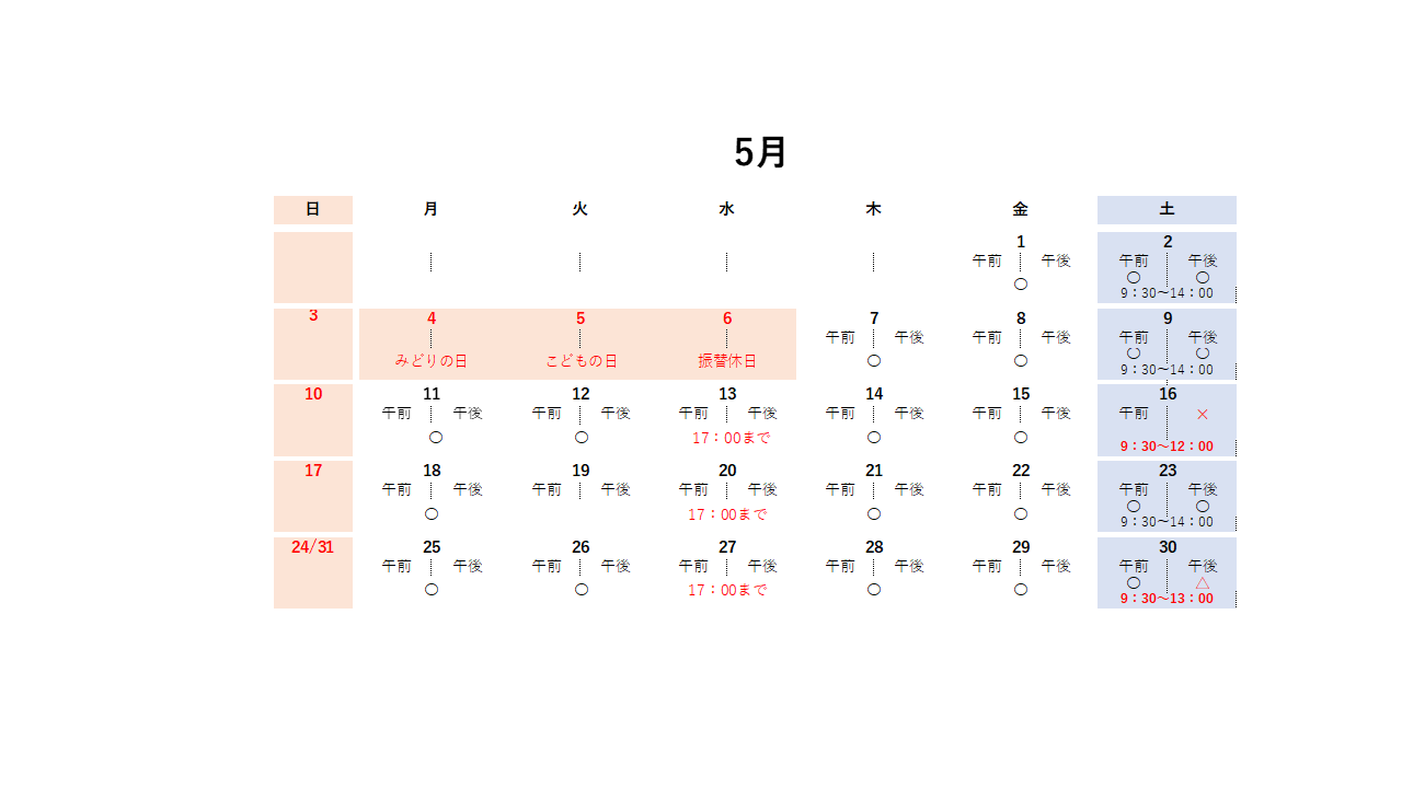 | 施術時間 | 月 | 火 | 水 | 木 | 金 | 土 | 日 |