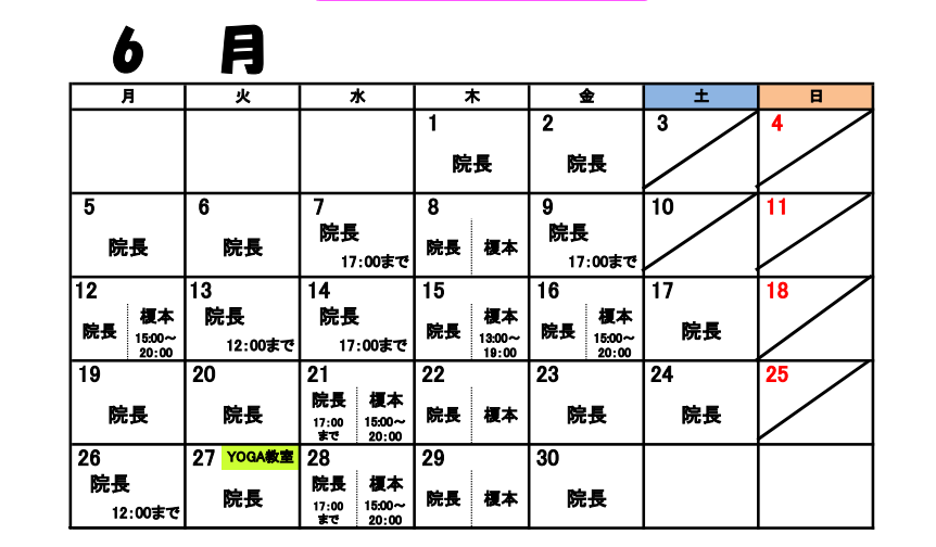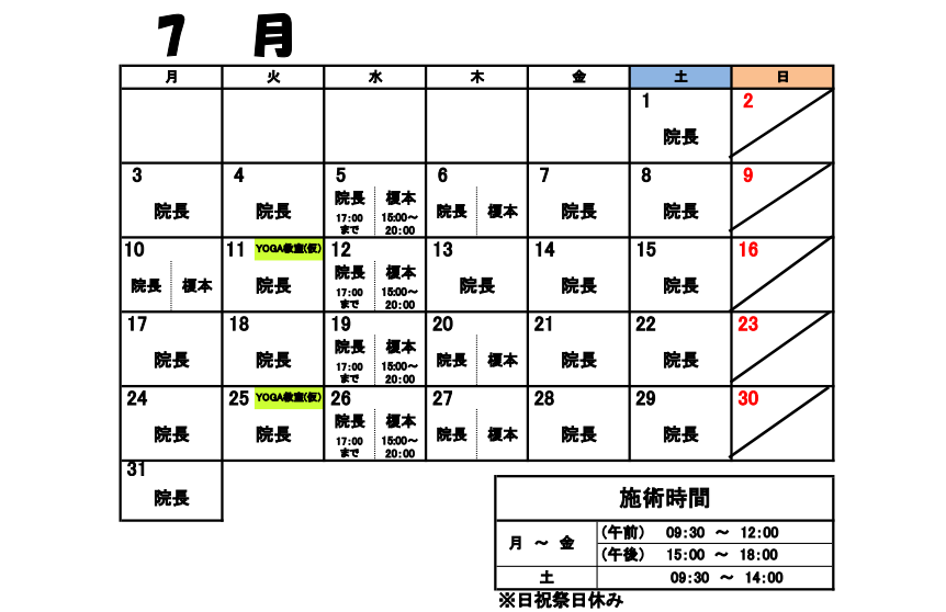 こんにちは。施術担当の出勤カレンダーと休診のお知らせをご案内いたします。